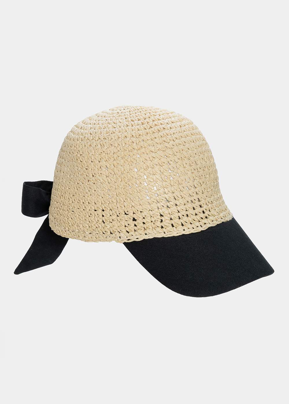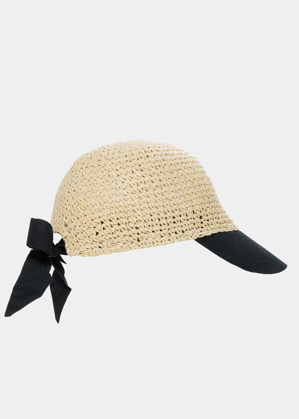 Beige jockey straw hat with black brim