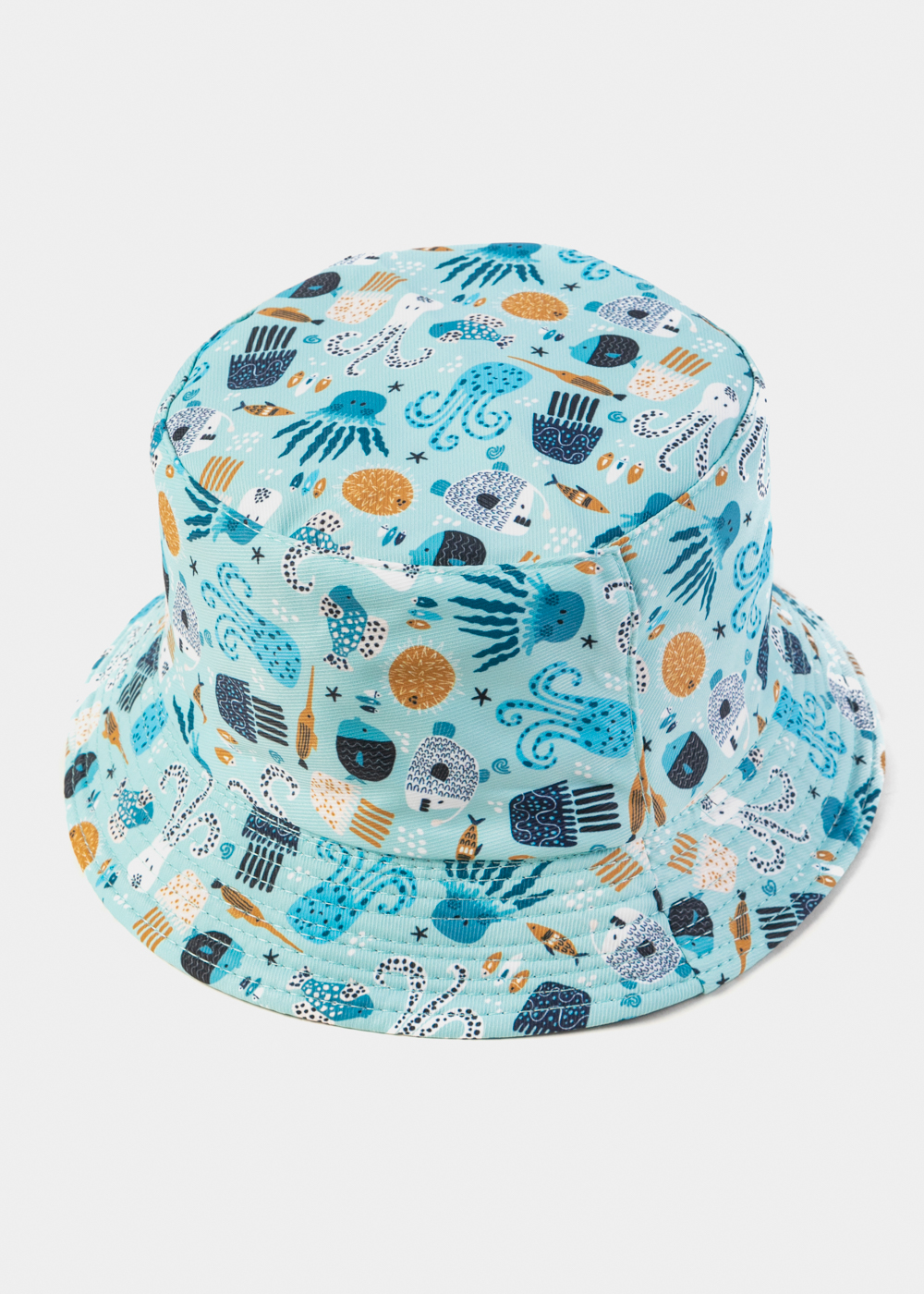 Blue Double Face Kids Bucket Hat w/ Sea Elements Pattern