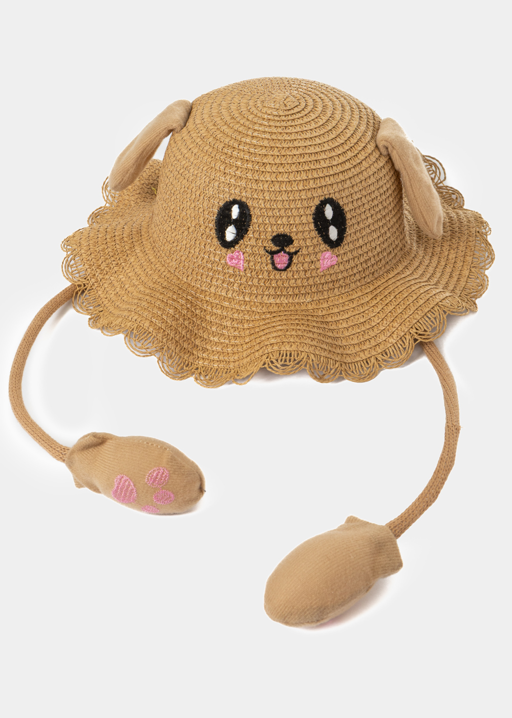 Brown Kids Straw Bucket Hat w/ Smiley & Wiggly Ears