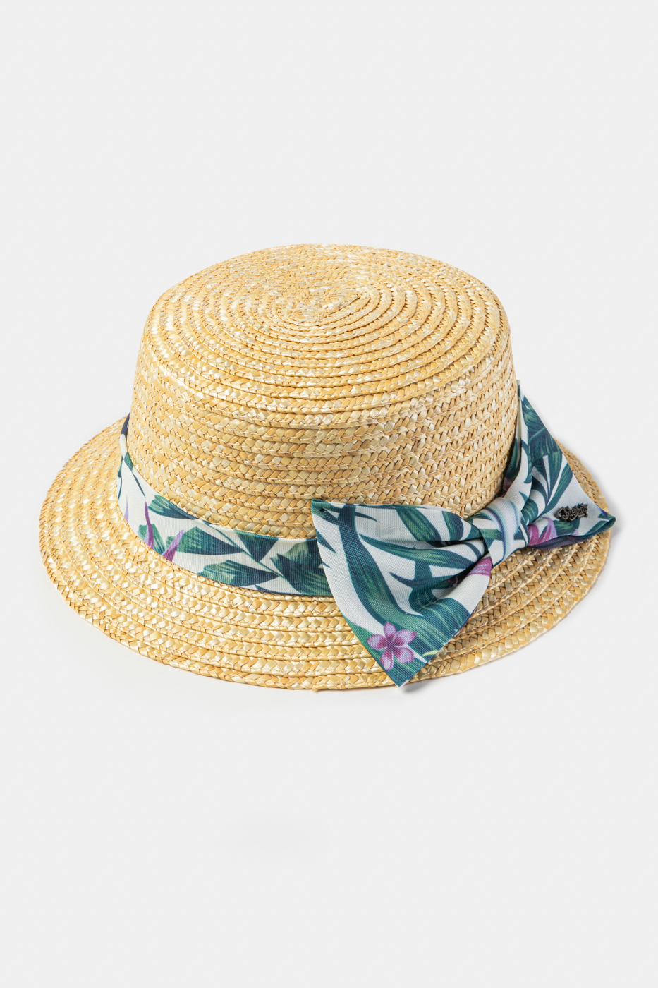 Natural Straw Boater Hat w/ Green Patterned Ribbon