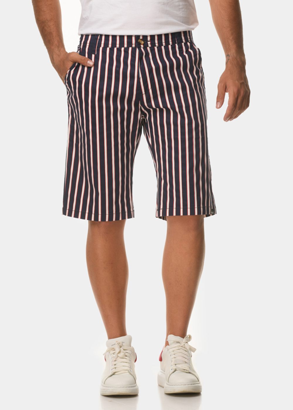 • Μπλε βαμβακερό παντελόνι με κόκκινη και λευκή ρίγα